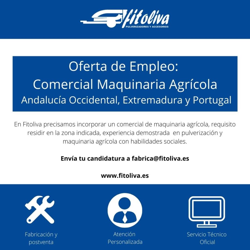 ¿Buscas trabajo en el sector agrícola? Si tienes experiencia en maquinaria agrícola y en particular en pulverización, en Fitoliva, ofrecemos el puesto de comercial para la zona de Andalucía Occidental, Extremadura y Portugal.